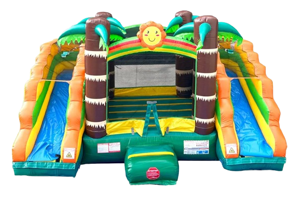 These unique units offer an experience like no other, showcasing not one, but TWO slides on either side of its spacious 10 foot x 9 foot bouncing area for twice the fun. The slides can be used with or without water and this unit comes. Simply connect a standard garden hose and you're all ready to go! With bright, vibrant colors and a cool jungle theme, tall palm tree topped pillars, a bouncing area, and two slides, this unit will be such an absolute hit on any summer day or backyard event that it'll have you wishing you were a kid again!