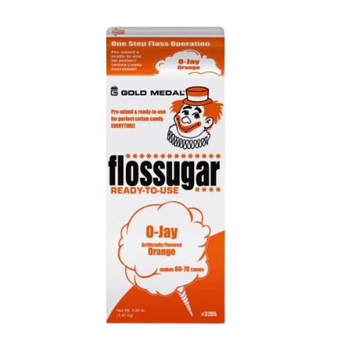A must for all cotton candy makers, Flossugar is our signature blend of the most perfectly balanced sugar - not too fine, not too coarse, maximum flavor. With no messy mixing or sugar buckets, our O-Jay (Orange) Flossugar #3205 is ready to use right from the box by pouring directly into the spinner head and easy to change colors each time you add sugar. 1/2-gal. carton - APPOX 60-70 SERVINGS)